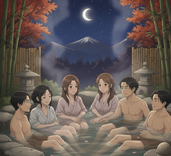 風呂につかりながら、地元ならではの観光ポイントなどを聞きながらみんなで話していたら。